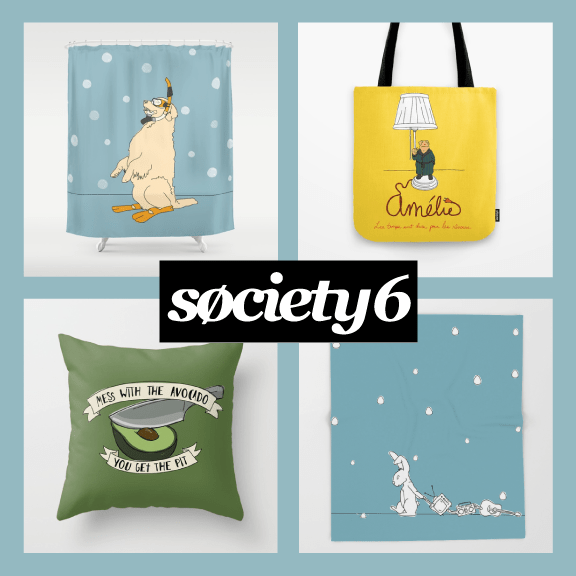 I have a Society6 artist page! You can find different items with my art on them: anything from art prints to home goods – pillows, blankets, clocks (for some reason), notebooks, even clothing.